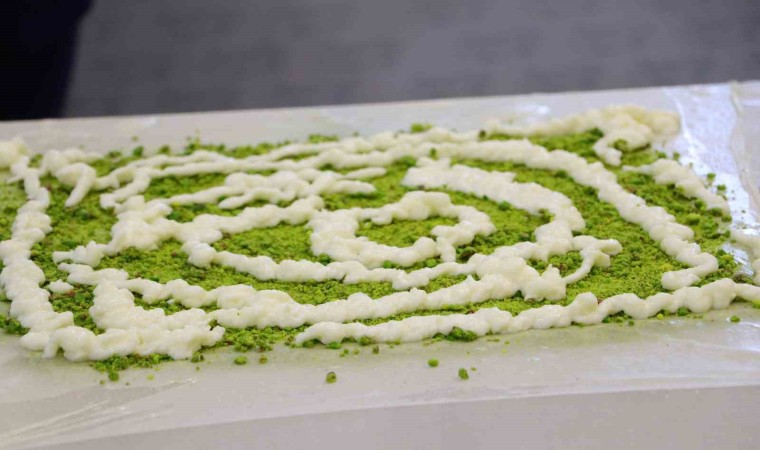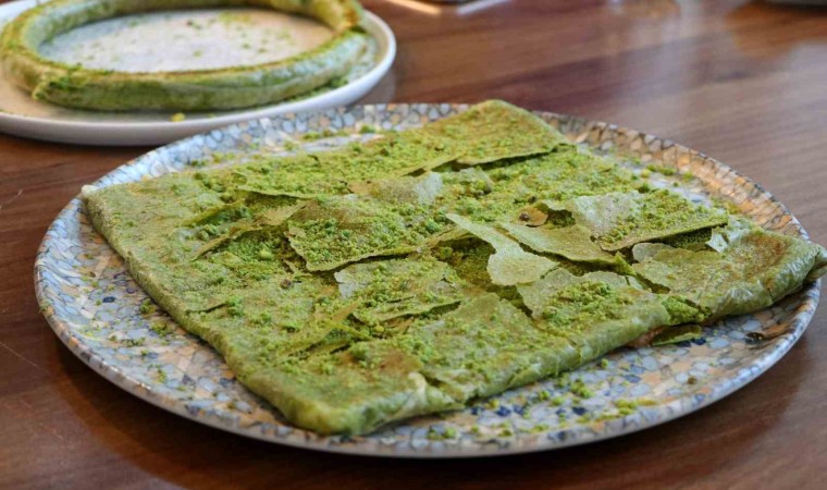 Tatlı olarak tanınan ve Gaziantep’te kahvaltıda yenen katmer, hamur, kaymak, fıstık ve şekerin buluşması ile hazırlanıp fırında pişiriliyor.