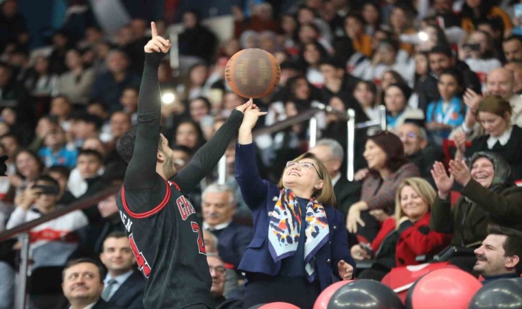 Basketbol gösterisinde oyuncular, Gaziantep Büyükşehir Belediye Başkanı Fatma Şahin’i gösteriye dahil etti. Oyuncu, Başkan Fatma Şahin’in yanına gelerek selamlaştıktan sonra parmağında çevirdiği topu Şahin’in parmağına yerleştirince gösteriye Şahin de dahil oldu.