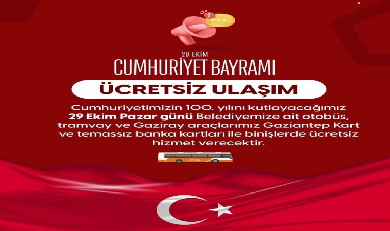 GAZİULAŞ’tan yapılan açıklamaya göre, Cumhuriyetin 100. yılının kutlanacağı 29 Ekim Pazar günü belediyeye ait otobüs, tramvay ve Gaziray seferleri Gaziantep Kart ve temassız kartlarla yapılan ödemelerle ücretsiz kullanılabilecek.