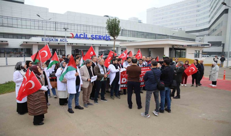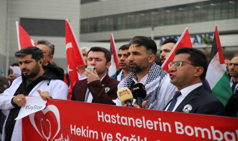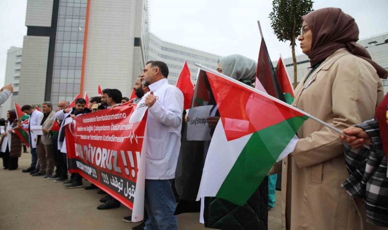 Gaziantep Şehir Hastanesi önünde bir araya gelen doktorlar ve sağlık çalışanları, İsrail’in Gazze’de Şifa Hastanesi ile diğer hastanelere yönelik saldırılarına tepki gösterdi.