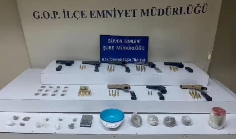 Gaziosmanpaşa Emniyet Müdürlüğü ekipleri tarafından, uyuşturucu satıcılarına yönelik yapılan çalışmalar neticesinde, uyuşturucu madde ticareti yapan şüphelileri tespit etti. 23 Kasım Perşembe günü , Yenimahalle’de bir iş yerine giren polis ekipleri, yaptıkları aramada çeşitli türlerden yaklaşık 800 gram uyuşturucu madde, 8 ruhsatsız tabanca, 160 mermi ele geçirdi. Operasyonda Z.Ş, C.O. Y.A., F.S.Ç., gözaltına alındı. (DHA)