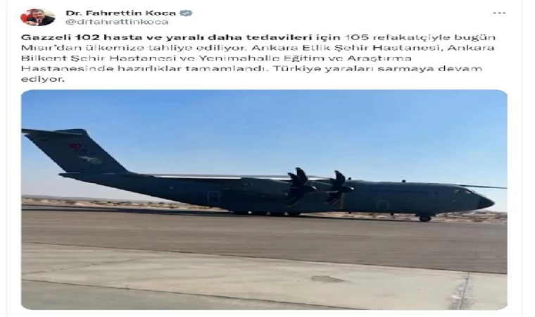 Bakan Koca, sosyal medyadan yaptığı açıklamada, "Gazzeli 102 hasta ve yaralı daha tedavileri için 105 refakatçiyle bugün Mısır'dan ülkemize tahliye ediliyor. Ankara Etlik Şehir Hastanesi, Ankara Bilkent Şehir Hastanesi ve Yenimahalle Eğitim ve Araştırma Hastanesinde hazırlıklar tamamlandı. Türkiye yaraları sarmaya devam ediyor" dedi. (DHA)