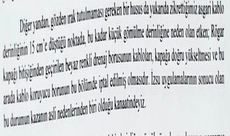 "Gözden uzak tutulmaması gereken bir husus da asgari kablo derinliğinin 15 cm’ye kadar düştüğü noktada bu kadar küçük gömülme derinliğine neden olan etken, rögar kapağı bitişiğinden geçirilen beyaz renkli drenaj borusunun kabloları, kapağa doğru yükselmesi ve bu arada kablo koruyucu borunun bu bölümde iptal edilmiş olmasıdır. İZSU uygulamalarının sonucu olan bu durumun kazanın asli nedenlerinden biri olduğu kanaatindeyiz.”