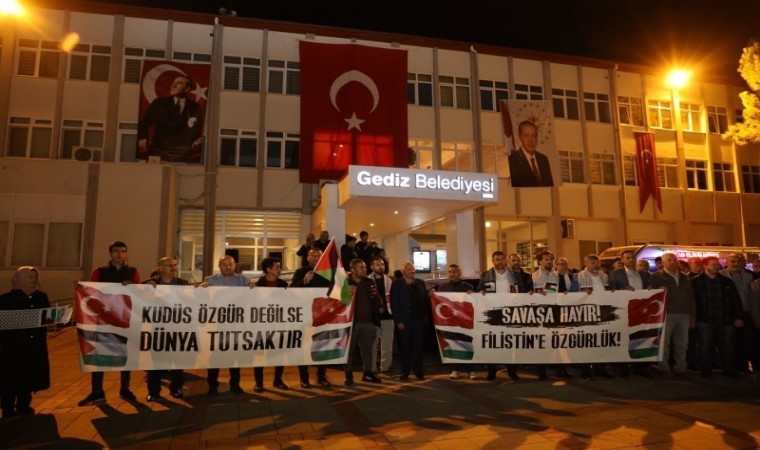 Ellerinde Türkiye ve Filistin bayrakları taşıyan Gedizli vatandaşlar, Filistin’e destek, İsrail’e protesto içerikli sloganlar eşliğinde Gediz Kültür Merkezinden Gediz Belediyesine kadar yürüdü.