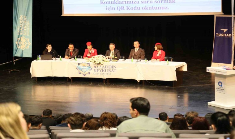 Alanya Alaaddin Keykubat Üniversitesi (ALKÜ), öğrencilerine teorik ve uygulamalı düzenlenen eğitimlerin yanında bölümlerle ilgili sektörlerle ve sektörlerdeki uzman isimlerle öğrencilerini buluşturmaya devam ediyor. Antalya’nın batı bölgesinin tek havalimanının bulunduğu Gazipaşa’daki ALKÜ Gazipaşa Havacılık ve Uzay Bilimleri Fakültesi de öğrencilerinin en iyi şekilde yetişmesi için çeşitli etkinliklere imza atıyor. Bu kapsamda fakülte öğrencileri, “Geleceğin Havacıları Gazipaşa’dan” isimli konferansta Tüm Sivil Havacılar Derneği (TÜSHAD) iş birliği ile konuk olan Türk Hava Yollarında (THY) görevli Kaptan Pilot Mehmet Tolga Günel, Kıdemli Kabin Amiri Yasemin Duran, Kabin Amiri Merve Güler, Kargo Vardiya Şefi Adem Soner Sarı, Kabin Memuru TÜSHAD Genel Sekreteri Çağrı Kaya’dan tecrübelerini dinledi.