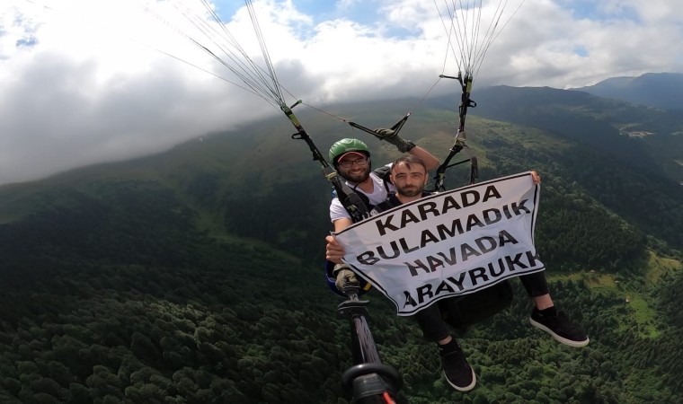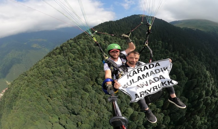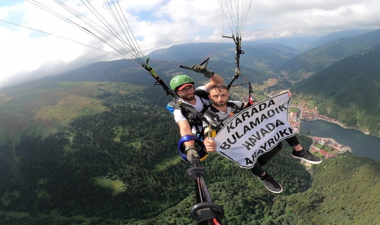 Trabzon’un Çaykara ilçesinin turizm merkezi Uzungöl’ün yüksek kesimlerinden yamaç paraşütü ile atlayan 34 yaşındaki Trabzonlu Muhittin Akbaş, evlenmek için görüştüğü kızların kendisinden ekonomik olarak çok zorladığını ve ev-araba gibi taleplerde bulunduğunu belirterek bu durumu bin 500 metre yükseklikte gökyüzünde açtığı “Karada bulamadık, havada arayruk” pankartı ile protesto etti.