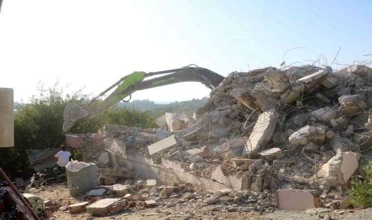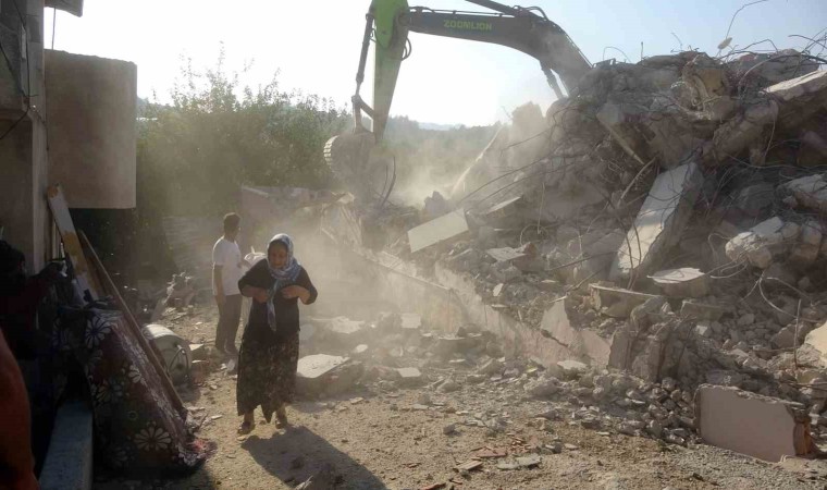 Depremin vurduğu Hatay’da birlikte yaşadıkları ağır hasarlı evlerinin yıkımını acı içerisinde izleyen gelin ve kaynana gözyaşlarına hakim olamadı.
