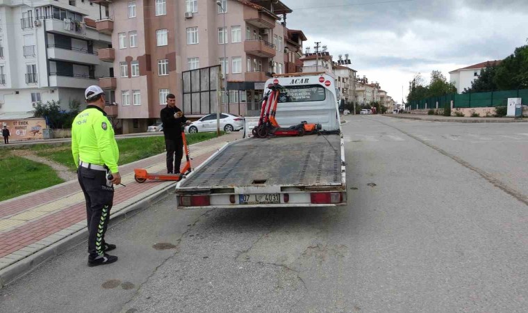 Trafik ekipleri Akdeniz Üniversitesi Manavgat Meslek Yüksek Okulunun da bulunduğu Emek Mahallesi’nden başlayarak Manavgat şehir merkezinde gelişigüzel park edilen elektrikli scooterları belgeleyerek gerekli cezai işlemleri uygulayıp trafikten men ettikten sonra çekici vasıtasıyla yediemin otoparkına çektirdi.
