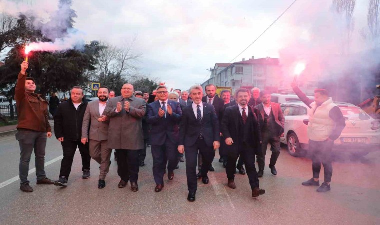 Salona meşaleler ve sloganlar eşliğinde kortej halinde yürüyerek gelen Yeniden Refah Partisi Gemlik Belediye Başkan Adayı Gencay Yılmaz, salon girişinde alkışlarla karşılandı.