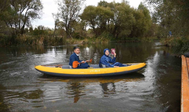 Hatıra fotoğraflarının ardından yeni evlenen genç çiftler kanoya binerek Zamantı Irmağı’nın doğal güzelleri arasında mutluluğa kürek çekti.