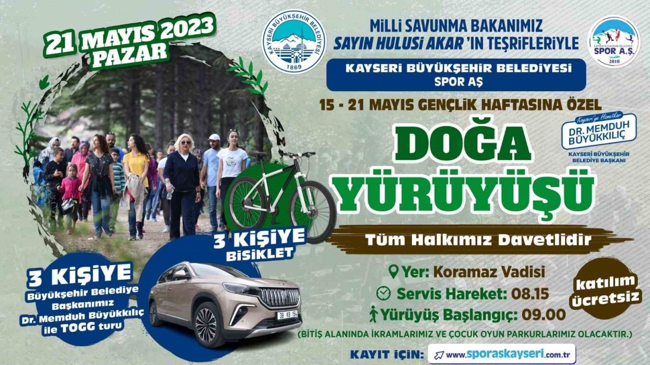 Kayseri Büyükşehir Belediyesi bünyesinde kentte spor faaliyetlerini yürüten Spor A.Ş. ‘Doğada buluşalım’ sloganı ile ‘15-21 Mayıs Gençlik Haftası’na Özel Doğa Yürüyüşü’ etkinliği düzenliyor. 21 Mayıs Pazar günü düzenlenecek etkinlikte çekilişle belirlenecek 3 kişiye bisiklet hediyesi ve 3 kişiye de Büyükşehir Belediye Başkanı Dr. Memduh Büyükkılıç ile TOGG turu hediyesi katılımcıları bekliyor.