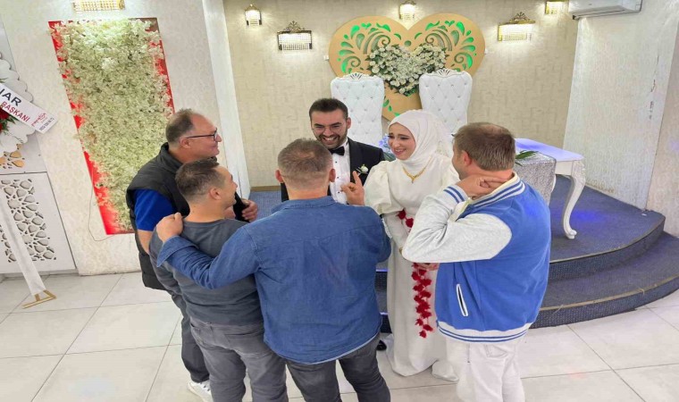 Damat Musab Hadiç ise, “Kahramanmaraş’ta yaşadığım ev depremde yıkıldı ve ben de enkazdan çıkarıldım. Eşimin yanına gitmek istedim ve o tek başınaydı kimsesi yoktu ona destek olmak istedim. Bende yaralıydım. Gönüllü abilerimiz geldi ve 8 gün boyunca hiç durmadan çalıştılar ve cenazeleri çıkardılar. Kendileri şimdi düğünümüze geldi sağ olsunlar” diye konuştu.