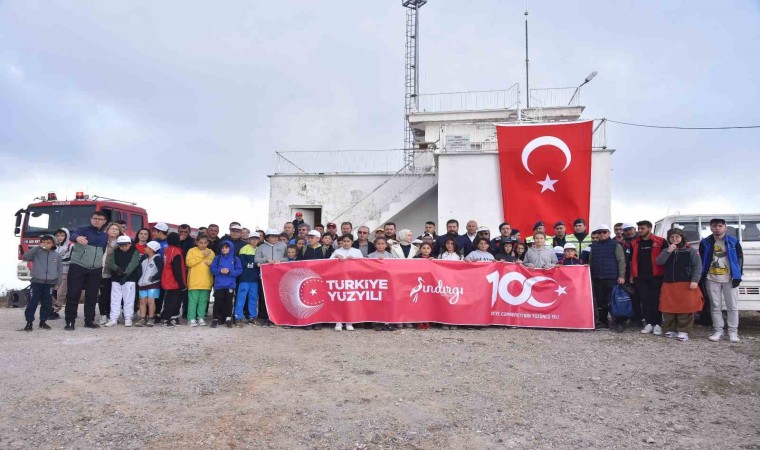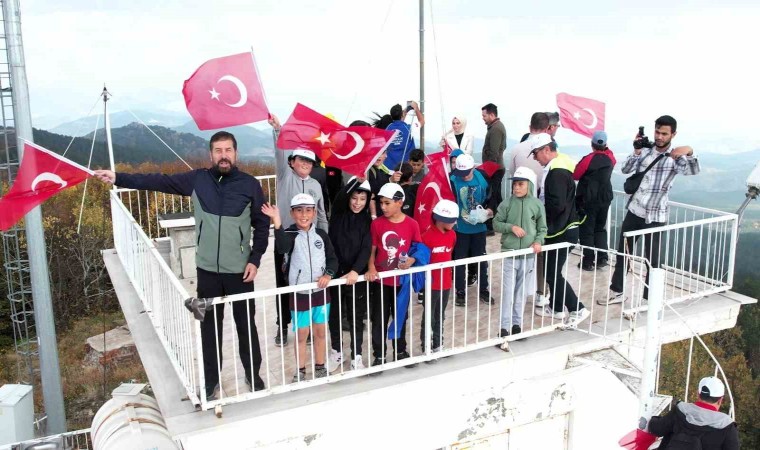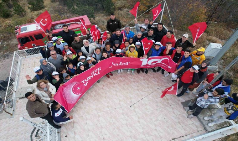 Türk bayrakları ve marşlar eşliğinde zirveye yürüyen kafile 1769 rakımlı yangın gözetleme kulesinde 100. Yıl afişini açarak hatıra fotoğrafı çekildi.