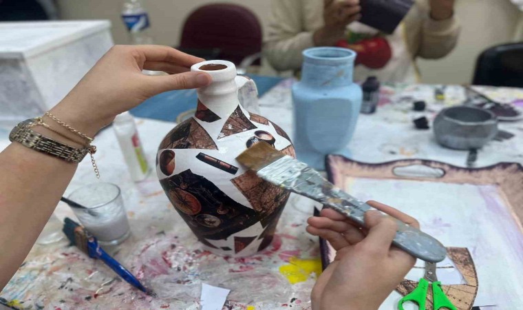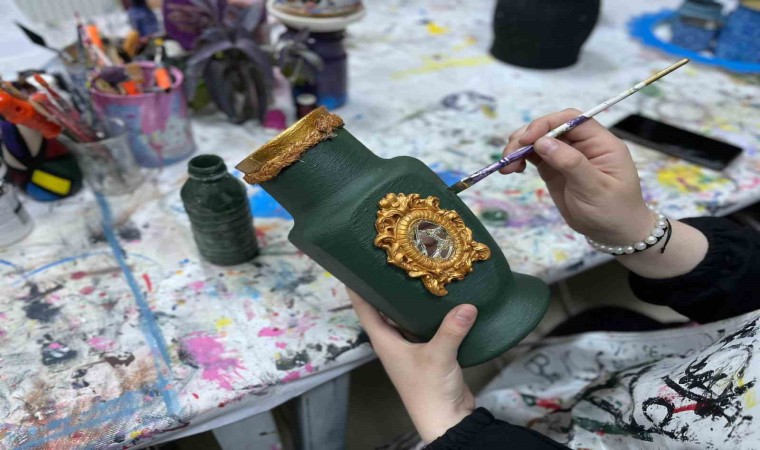 Muş’ta ‘Güzel Sanat Atölyesi’ kapsamında açılan geri dönüşüm kursuna katılarak atık malzemelere hayat veren gençler, hem güzel vakit geçiriyor hem de sanat öğreniyor.