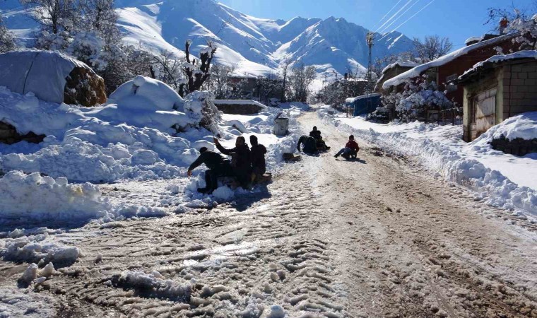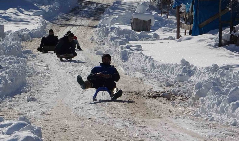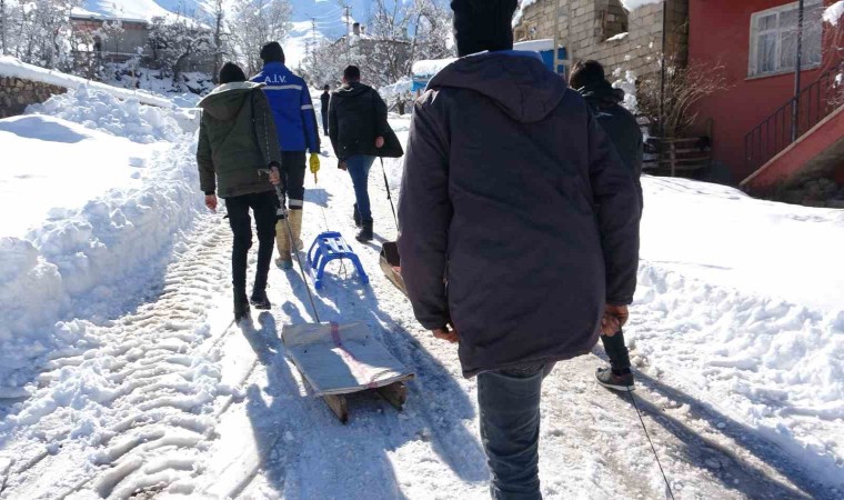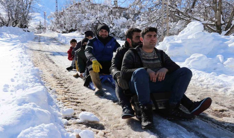 Gevaş’ta kar yağışı hayatı olumsuz etkilerken, ilçeye bağlı Elmalı Mahallesinde bir araya gelen gençler, kendi imkanlarıyla yaptıkları kızaklarla kaymanın keyfini yaşadı. Soğuğa aldırış etmeden yaklaşık iki kilometre yürüyen gençler, Artos Dağı eteklerinden başlayarak evlerinin önüne kadar kayıyorlar. Yaşları 13 ile 25 arasında değişen gençler, hafta sonu tatili olması nedeniyle zamanlarını kızakla kayarak geçirdiklerini dile getirdiler. Kızak keyfinin çocukluktan gelen ve her daim sevilen bir aktivite olduğunu belirten Mahmut İdiz, “Geçen senden beri kurak geçiyordu. Yağsa da hemen eriyordu. Şimdi çok şükür kar yağdı. Bizde çocukluğumuza geri döndük. Bir yıldır kızaklarımız içerdeydi. Onlar da bizim gibi paslanmıştı. Pasını aldık” dedi.