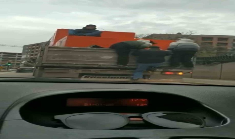 Olay, merkez Osmangazi ilçesinde meydana geldi. Sürücüsü ve plakası henüz öğrenilemeyen kamyonun arkasına 3 genç kaçak bindi. Canlarını hiçe sayan gençler, kamyonun arkasında seyahat etmeye başladı. Tehlikeli anlar, saniye saniye amatör kameraya yansıdı.