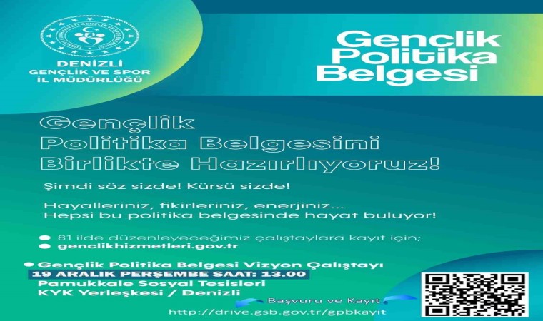 Gençlik Politika Belgesi Vizyon Çalıştayı 19 Aralık 2024 Perşembe günü Denizli’de yapılacak. Gençlerin sesini duyuracağı, çözümler üreteceği ve görüşlerini politikaya yansıtacağı çalıştaya Denizli’de ki 15-29 yaş aralığındaki tüm gençler katılabilecek.