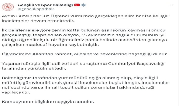 Gençlik ve Spor Bakanlığı tarafından meydana gelen olayın ardından yapılan açıklamada yurt müdürünün açığa alındığı ve olayla ilgili müfettiş görevlendirildiğini belirtildi. Gençlik ve Spor Bakanlığı’ndan yapılan açıklamada, "Aydın Güzelhisar Kız Öğrenci Yurdu’nda gerçekleşen elim hadise ile ilgili incelemeler devam etmektedir. İlk belirlemelere göre zemin katta bulunan asansörün kayması sonucu gerçekleştiği tespit edilen olayda, 15 evladımızın sağlık durumunun iyi olduğu öğrenilmiştir. Bir öğrencimiz panik halinde asansörden çıkmaya çalışırken maalesef hayatını kaybetmiştir. Öğrencimize Allah’tan rahmet, ailesine ve sevenlerine başsağlığı dileriz. Yaşanan süreçle ilgili adli ve idari soruşturma Cumhuriyet Başsavcılığı tarafından yürütülmektedir. Bakanlığımız tarafından yurt müdürü açığa alınmış olup, olayla ilgili müfettiş görevlendirilerek gerekli incelemeler başlatılmıştır. İncelemeler neticesinde varsa ihmali tespit edilen sorumlular hakkında gereği yapılacaktır. Kamuoyunun bilgisine saygıyla sunulur" ifadelerine yer verildi.