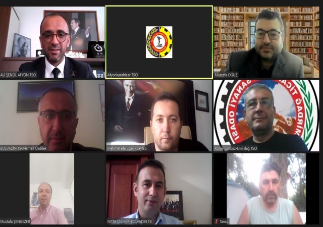 Afyonkarahisar'da, Türkiye Odalar ve Borsalar Birliği'ne bağlı çalışan oda ve borsaların genel sekreterleri, video konferans yöntemiyle bir araya geldi. Toplantıda oda çalışmaları değerlendirilirken genel bir istişare gerçekleştirildi. Afyonkarahisar Ticaret ve Sanayi Odası Genel Sekreteri Ali Şenol, Bolvadin Ticaret ve Sanayi Odası Genel Sekreteri İsmail Özdilek, Bolvadin Ticaret Borsası Genel Sekreteri Fatih Çeliker, Çay Ticaret ve Sanayi Odası Genel Sekreteri Mehmet Efe Uçan, Dinar Ticaret ve Sanayi Odası Genel Sekreteri Tansu Kurt, Emirdağ Ticaret ve Sanayi Odası Genel Sekreteri Koray Gürbüz, Sandıklı Ticaret Borsası Genel Sekreteri Mustafa Şengezer ve Sandıklı Ticaret ve Sanayi Odası Genel Sekreteri Mustafa Oğuz'un katıldığı toplantıda, oda çalışmaları ve genel işleyiş ele alındı.