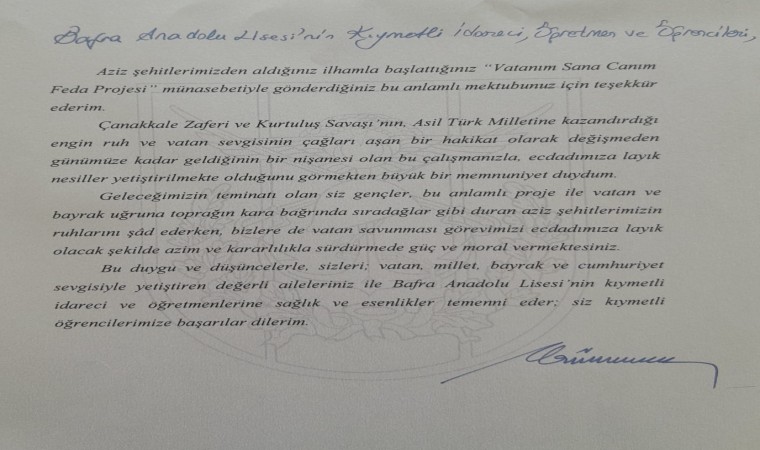 Samsun Bafra Anadolu Lisesinde düzenlenen "Vatanım Sana Canım Feda" etkinliğinde 700 öğrencinin imzalayarak, Genelkurmay Başkanı Orgeneral Metin Gürak’a gönderdiği mektuba cevap geldi.