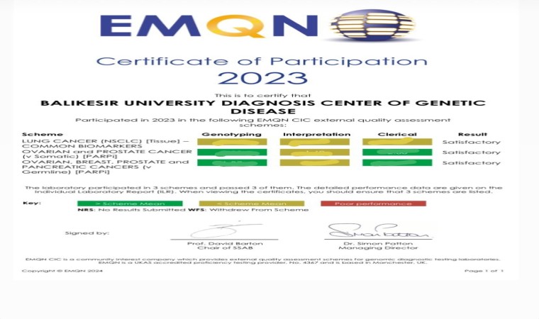 Balıkesir Üniversitesi Hastanesi bünyesinde bulunan Genetik Hastalıklar Değerlendirme Merkezi, Avrupa Moleküler Genetik Kalite Ağı (EMQN) tarafından, ülkemizde ve dünyada önemli hastalık grubu olan kanser (akciğer kanseri, prostat kanseri, meme kanseri ve yumurtalık kanseri) alanında hedefe yönelik tedavilerin düzenlenmesi için yapılan genetik testlerde 2023 yılında başvurmuş olduğu 3 ana farklı programdan da başarılı bulunarak uluslararası düzeyde akredite edildi. Böylece bu alanlardaki genetik test sonuçlarının ülkemizdeki geçerliliğinin yanı sıra uluslararası alanda da güvenirliliği onaylanmış oldu.