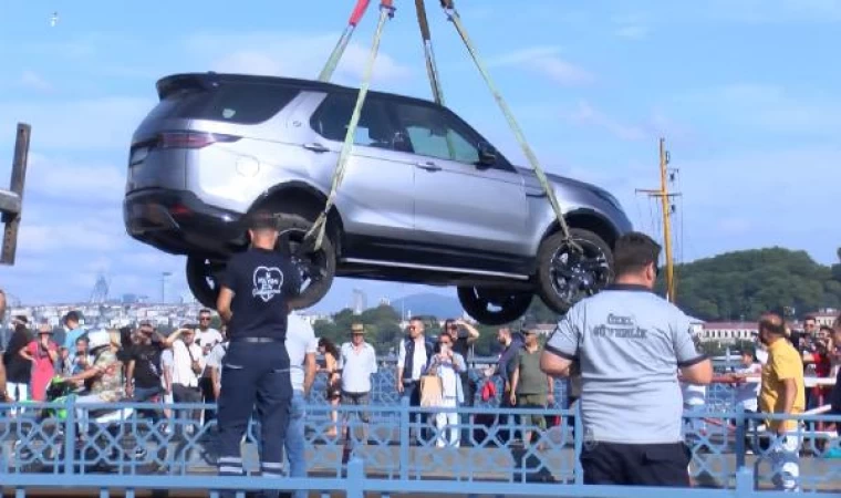 Mustafa Mert KARACA/İSTANBUL,(DHA)-GALATA Köprüsü'nde tramvay yoluna girerek sıkışan cip, vinç yardımıyla kaldırıldı, tramvay seferleri normale döndü.