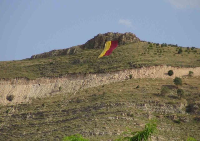 BATMAN'IN GERCÜŞ İLÇESİNDE GALATASARAY TARAFTARLARI, ŞAMPİYONLUK KUTLAMALARI KAPSAMINDA HAZIRLADIKLARI 30 METRE UZUNLUĞUNDA, 15 METRE GENİŞLİĞİNDE 450 METREKARE DEV GALATASARAY BAYRAĞINI İLÇENİN EN YÜKSEK YERİNE ASTI.