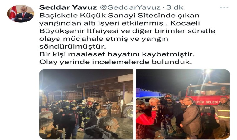 Vali Yavuz sosyal medya hesabından yaptığı yazılı açıklamada, “Başiskele Küçük Sanayi Sitesi’nde çıkan yangında 6 iş yeri etkilenmiş, Kocaeli Büyükşehir İtfaiyesi ve diğer süratle olay yerine müdahale etmiş ve yangın söndürülürmüştür. Bir kişi maalesef hayatını kaybetmiştir” ifadelerini kullandı.