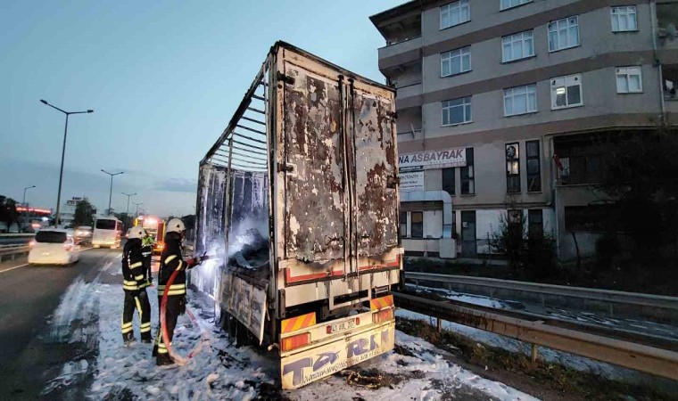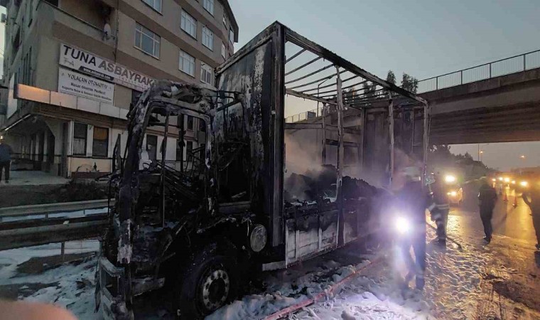 Kocaeli’nin Çayırova ilçesinde plastik yüklü kamyon alev alev aldı. Kamyondan geriye iskeleti kaldı.
