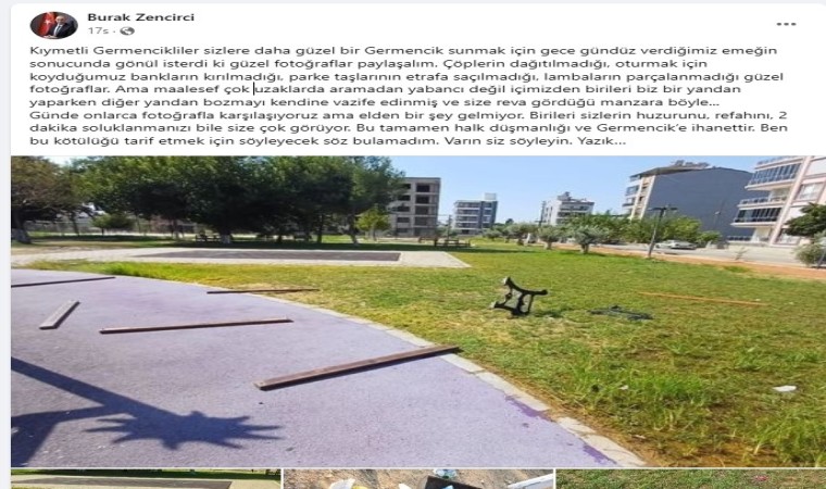 Başkan Zencirci Germenciklilere hitaben yaptığı paylaşımda, "Kıymetli Germencikliler, sizlere daha güzel bir Germencik sunmak için gece gündüz verdiğimiz emeğin sonucunda gönül isterdi ki güzel fotoğraflar paylaşalım. Çöplerin dağıtılmadığı, oturmak için koyduğumuz bankların kırılmadığı, parke taşlarının etrafa saçılmadığı, lambaların parçalanmadığı güzel fotoğraflar. Ama maalesef, çok uzaklarda aramadan, içimizden birileri biz bir yandan yaparken diğer yandan bozmayı kendine vazife edinmiş ve size reva gördüğü manzara böyle" dedi.