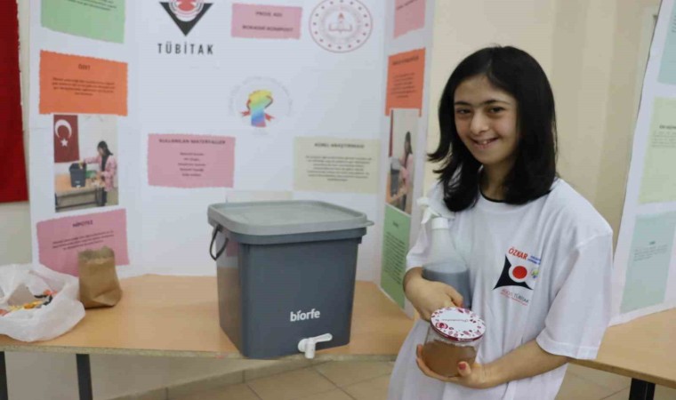 Proje hakkında bilgiler veren Resim Öğretmeni Gülay Çelen, “Kızımızla beraber Bokashi Kompost projesini geliştirdik. Bokashi Japonca’da organik madde demek. Bizler mutfaklarımızda kullanılan organik maddeleri ve gıda atıklarını kompost kovasına koyuyoruz ve üzerine tamamen yararlı mikro organizmalardan oluşmuş sıvımızı koyuyoruz. Bu sıvımız pirinç, su, süt ve pekmezden oluşmaktadır. Bu sıvımızı atıkların üzerine sıkıyoruz ve kapağımızı kapatıyoruz. 1-2 gün sonra kovamız sayesinde altındaki musluktan sıvı gübre almaya başlıyoruz. Bu sıvı gübreyi sulandırıp saksılarımıza, çiçeklerimizde gübre olarak kullanıyoruz. Kovamız tamamen dolduktan sonra iki gün karanlıkta beklettikten sonra bu gıda atıklarımızı toprağa gömüyoruz. Yararlı mikroorganizmalar sayesinde bu atıkların hücre zarı parçalandığı için kısa sürede katı gübreye dönüşüyor. Bu katı gübrenin de toprağı iyileştirme özelliği vardır" ifadelerini kullandı.