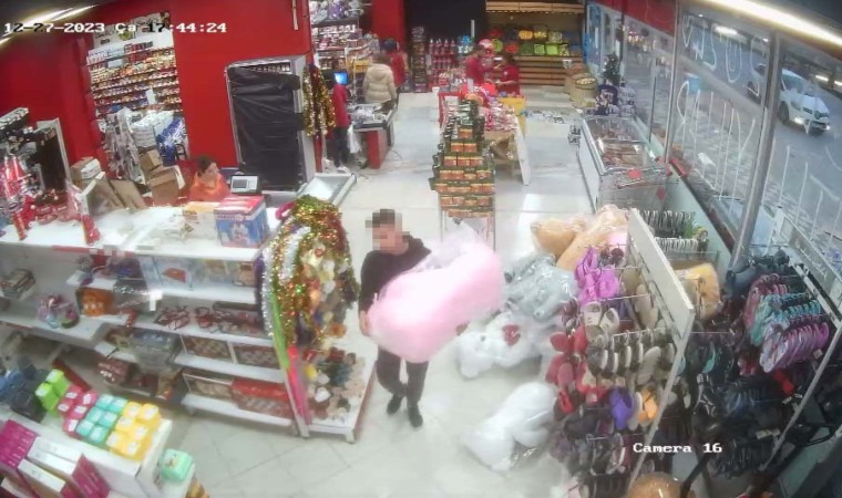 Afyonkarahisar’da bir markete giren genç şahıs, boyu yaklaşık 1 metre olan bin TL değerindeki oyuncak ayıyı çalarak kayıplara karıştı.