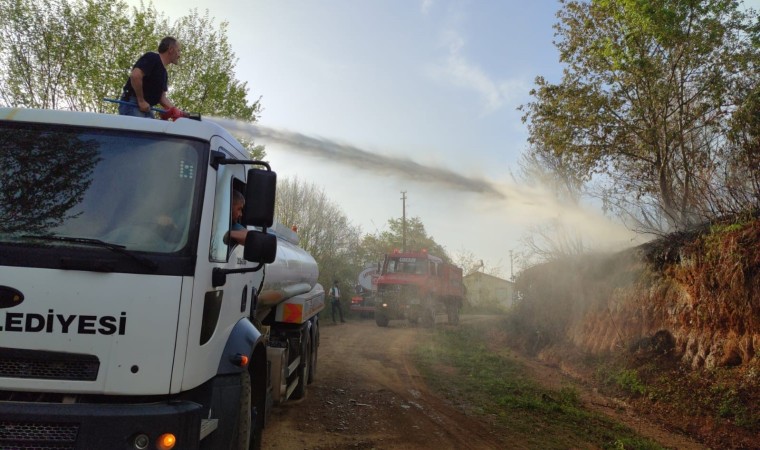 Giresun’un Eynesil ile Trabzon’un Beşikdüzü ilçeleri sınırında çıkan yangında 80 dönümlük mera arazisi zarar gördü.