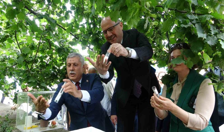 Kahverengi kokarca ile mücadele için Samuray arısı salınımına Giresun İl Tarım ve Orman Müdürü Dr. Muhammet Angın, Giresun il ve ilçe ziraat odası başkanları, muhtarlar ve fındık üreticileri katıldı.