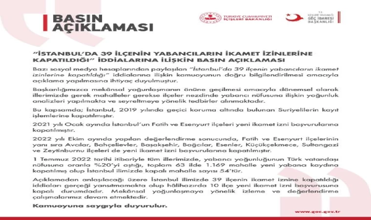 Başkanlıktan yapılan yazılı açıklamada, bazı sosyal medya hesaplarında, 'İstanbul'da 39 ilçenin yabancıların ikamet izinlerine kapatıldığı' yönünde paylaşımlar yapıldığı belirtilerek, kamuoyunun bu konuda doğru bilgilendirilmesi amacıyla açıklama yapılmasına ihtiyaç duyulduğu kaydedildi. Başkanlığın, mekansal yoğunlaşmanın önüne geçilmesi amacıyla dönemsel olarak illerde gerek mahalleler gerekse ilçeler nezdinde yabancı nüfusuna ilişkin yoğunluk analizleri yaptığı ve seyreltmeye yönelik tedbirler aldığı vurgulanarak, şöyle denildi: