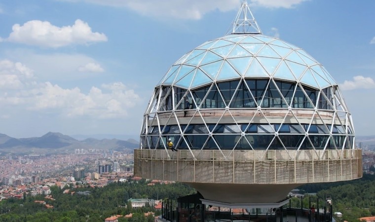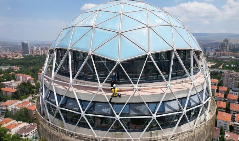 Gökdelenlerin yaygınlaşması ile dış cephe temizliği ve bakım onarım gibi iş kollarında çalışan iple erişim teknisyenleri, başkentin simge yapısı olan Atakule’de metrelerce yükseklikte mesai yapıyor.