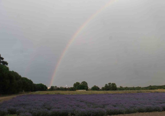 Edirne'de, yağışın ardından gökyüzünde beliren gökkuşağı, mor renkli lavanta tarlaları ile buluşarak muhteşem bir manzara oluşturdu. İlçelerde görülen yağışın ardından gökyüzünde beliren gökkuşağı, şehrin dört bir yanından görüldü ve vatandaşlar tarafından büyük bir ilgiyle izlendi. Doğal güzellikleri görenler, bu eşsiz manzaranın tadını çıkardılar. Lavanta tarlaları içinde gökkuşağı ile birlikte fotoğraflar çeken insanlar, bu güzel manzaradan dolayı büyük bir mutluluk yaşadıklarını ifade ettiler.