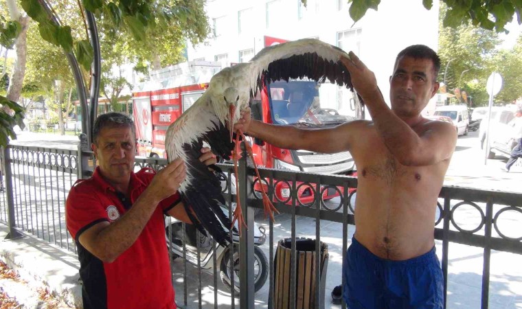 Leyleğin bitkin olduğunu ve kanadında kırık tespit eden itfaiye ekipleri, leyleği tedavisinin yapılması için barınağa götürdü.