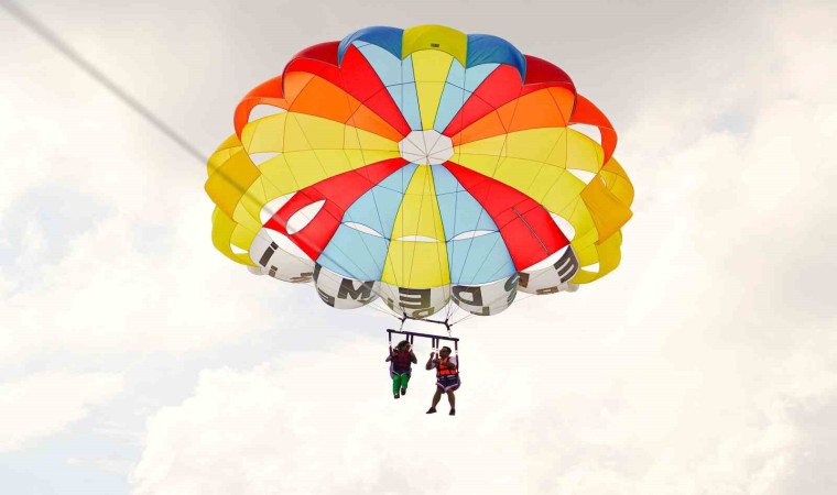 Mersin’de tekneden paraşütle uçan Musa Uysal, kız arkadaşına havada evlilik teklifi etti.