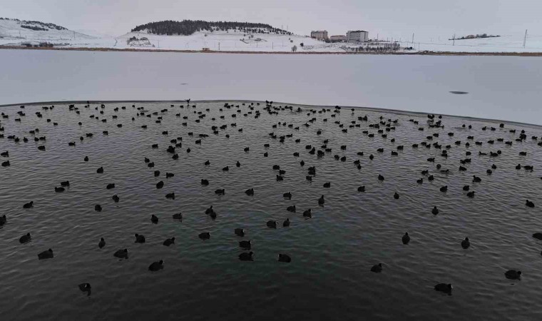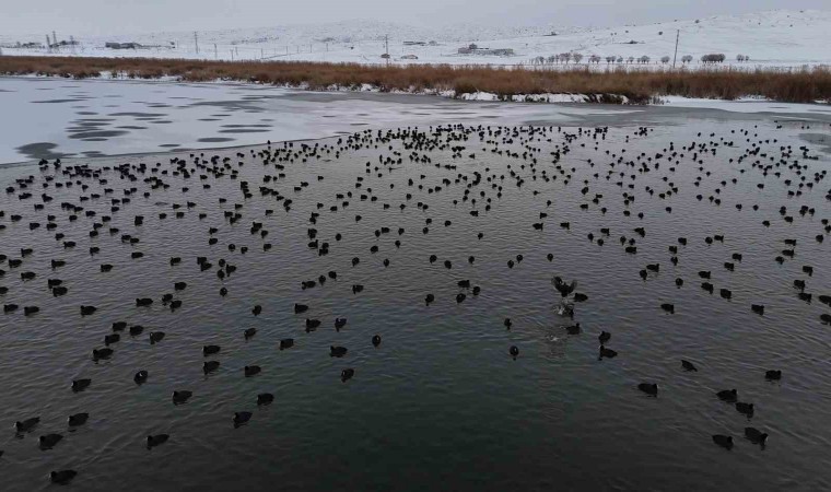 Sivas’ın Hafik ilçesinde bulunan Hafik Gölü’nün yüzeyi buz tuttu. Gölde buz tutmayan bazı kısımlarında toplanan yüzlerce sakarmeke kuşu ise adeta görsel şölen oluşturdu.