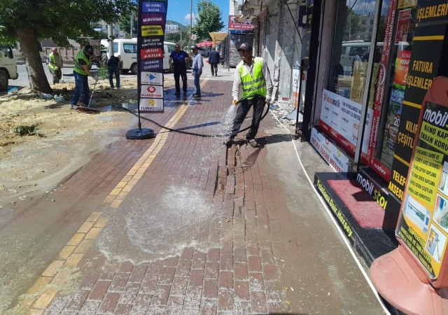 Adıyaman'ın Gölbaşı İlçe Belediyesi ekipleri, cadde ve sokakları tazyikli suyla temizleme çalışmalarını sürdürüyor.