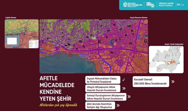 Kocaeli’ni depreme karşı dirençli şehir haline getirmek amacıyla çalışmalarını sürdüren büyükşehir belediyesi, şimdi de 1999 depreminden önce inşa edilen binaları afete hazırlıklı hale getirmek için gerekli adımları atıyor. Kentsel Dönüşüm Dairesi ile Afet İşleri Dairesi Başkanlığı’nı kuran, akademik çevrelerle oluşturulan Deprem Kurulu ile Afet Eylem Planı hazırlayan, buna bağlı olarak 14 maddelik Afet Eylem Planını hayata geçirmek için uzman isimlerle çalışma grupları oluşturan büyükşehir, deprem gerçeğini gündeminin ilk sırasında tutuyor. Son olarak Kocaeli Büyükşehir Belediyesi ve İMO Kocaeli Şubesi ile arasında yapılan protokole göre, 1999 Gölcük depremini geçiren ve Sismik Tehlike Bölgeleri Haritasında 1. Derece Tehlikeli alanda kalan 250 bin yapı detaylı olarak taranacak. Projede ilk 6 aylık dilimde 160 bini aşkın yapı stokunun taraması tamamlanacak. Yapılacak ikinci protokolle de sonraki 3 ay içinde 90 bin yapının daha incelenmesi hedefleniyor. İncelenecek yapı stoku sayısı 250 bin olacak. İmar ve Şehircilik Dairesi Başkanlığı Zemin Deprem İnceleme Şube Müdürlüğü ise yaklaşık 314 bin yapının taranmasına yönelik bina envater çalışması yürütüyor. Yapım yılı 2008 ve sonrası yapıların MAKS’a (Mekansal Adres Kayıt Sistemi’ne) kayıtlı olması sebebiyle bu tarihten önceki yapılara ait iskan ve ruhsat belgelerini tarayan büyükşehir ekipleri, bugüne kadar 159 bin 19 belgeyi sayısallaştırdı. Bu belgenin 33.128 adedini bina ile eşleştirerek her yapıya ait bir kimlik numarası veren büyükşehirin bu yöndeki çalışması devam ediyor.