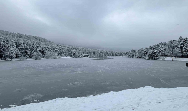 Gölcük Tabiat Parkı’nda hava sıcaklığının sıfırın altına düşmesiyle göl yüzeyi tamamen buz tuttu.