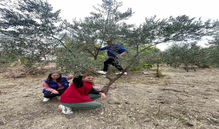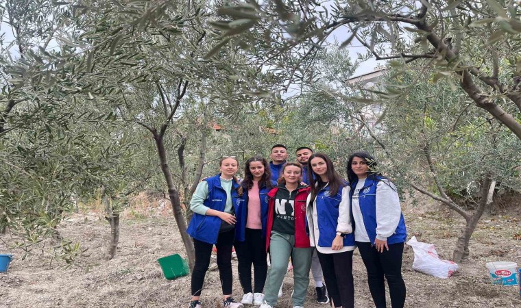 Gün boyu tarlada çalışmalara destek olan gönüllü öğrenciler, zeytin toplamanın zorluklarını da tecrübe etmiş oldu.