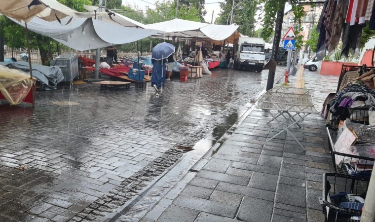 İlçenin pazarı ise gök gürültülü sağanak yağış sonrası biranda boşalırken, esnaf ise malzemelerini yağmurdan korumak için tezgahlarını topladı.