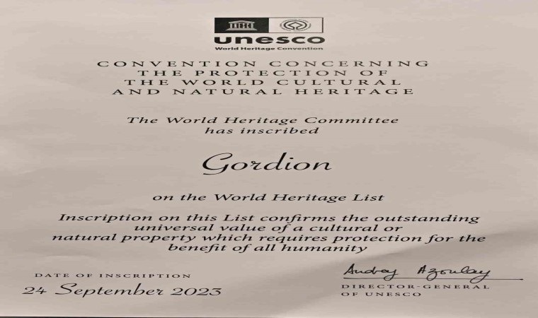 Ankara’nın Polatlı ilçesinde bulunan Gordion Antik Kenti ve Altındağ ilçesi Ulus bölgesinde bulunan Aslanhane Camii’nin UNESCO Dünya Mirası Kalıcı Listesi’ne kabulüne ilişkin hazırlanan sertifikalar, Ankara Büyükşehir Belediye Başkanı Mansur Yavaş’a sunuldu. Sertifikalar, UNESCO Türkiye Milli Komisyonu Yönetim Kurulu Başkanı Prof. Dr. M. Öcal Oğuz tarafından Başkan Yavaş’a takdim edildi. Böylelikle Gordion Antik Kenti ve Aslanhane Camii tüm insanlığın yararı için korunması gereken kültürel veya doğal varlık olarak tescillenmiş oldu.