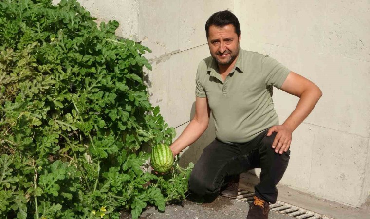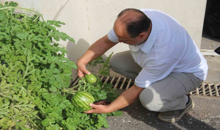 Karpuz yetiştirilmeyen Sivas’ta kaldırım üzerinde kendiliğinden yetişen karpuzlar görenleri hayrete düşürüyor.