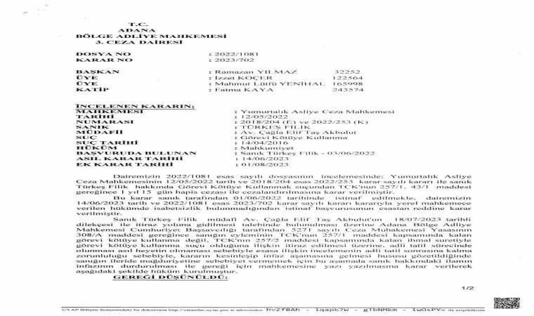 Görevden alınan başkan Türkeş Filik açıklamasında, “Yumurtalıklı hemşerilerimize olan sevgimiz ve hizmet aşkımız asılsız ve mesnetsiz suçlamalarla baltalanmaya çalışılmaktadır. Bu suçlamalardan, Yüce Türk adaleti ile Memurlar ve Diğer Kamu Görevlilerinin Yargılanması Hakkındaki Kanun çerçevesinde hakkımızda kararlar verilebilmektedir. Basına ve sosyal medyaya yansıyan 2011 yılında benim görev dönemimden önce inşa edilen bir kaçak yapının yıkılmaması ile ilgili Adana Bölge Adliye Mahkemesi 3. Ceza Dairesi tarafından 2022/1081 sayılı karar 14.06.2023 tarihinde verilmiş, şahsım ve avukatlarım ile Bölge Adliye Mahkemesi Başsavcılığına gerekçeleri ile yaptığımız itiraz Başsavcılık makamınca haklı görülerek kararı veren mahkemeye başsavcılık makamınca Ceza Muhakemesi Kanunu’nun (“CMK”) 308/A maddesi gereğince itiraz edilmiştir. BAM Başsavcılığı tarafından yapılan itiraz 01.08.2023 tarihinde Adana Bölge Adliye Mahkemesi 3. Ceza Dairesi tarafından görüşülerek dava dosyasının görüşülmesinin adli tatil sonrasına bırakılmasına, dava dosyası tekrar görüşülünceye kadar ‘İnfazın Durdurulmasına’ karar verilmiştir. İnfazın durdurulması kararı, mülki ve adli makamlarla paylaşılmış olup karara göre hareket edileceğinden zerre şüphemiz yoktur. Bizim çalışma azim ve karalılığımızı bir nebze olsun azaltmayacak aksine hizmet için bizi kamçılayacaktır. Çünkü Türk adaletine ve adalet sistemine güvenimiz tamdır. Ben ve ekip arkadaşlarım ilçemize hizmet için yaptığımız her iş ve işlemi mevcut kanun ve yönetmelikler çerçevesinde kamu yararını gözeterek yapıyoruz ve yapmaya devam edeceğiz"dedi.