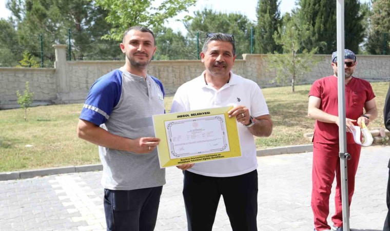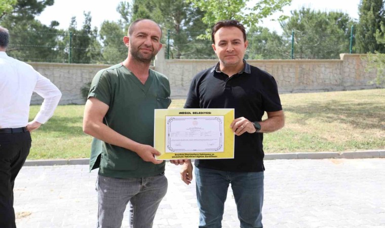 İnegöl Belediyesi Veteriner İşleri Müdürlüğü bünyesinde görev yapan personellere Halk Eğitim Merkezi iş birliğinde 96 saatlik ’Başıboş Hayvanları Yakalama ve Müdahale’ eğitimi verildi. Bu eğitimle bilgileri güncellenen ve daha donanımlı hale gelen saha ekiplerine sertifikalarını Belediye Başkanı Alper Taban takdim etti.