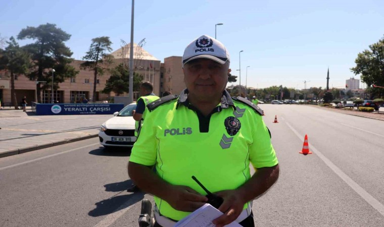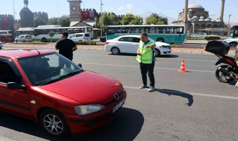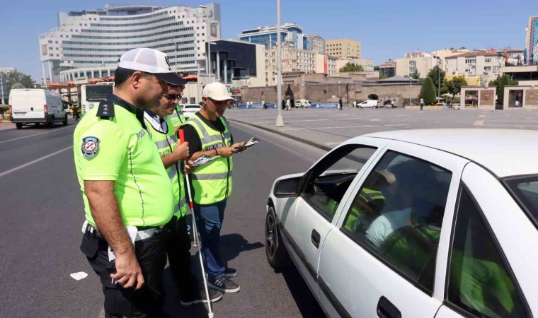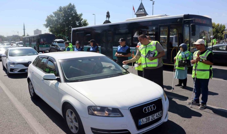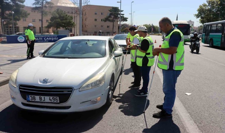 Kayseri’de trafik polisleri ile beraber trafik denetimine katılan görme engelli vatandaşlar, beyaz bastona dikkat çekti.